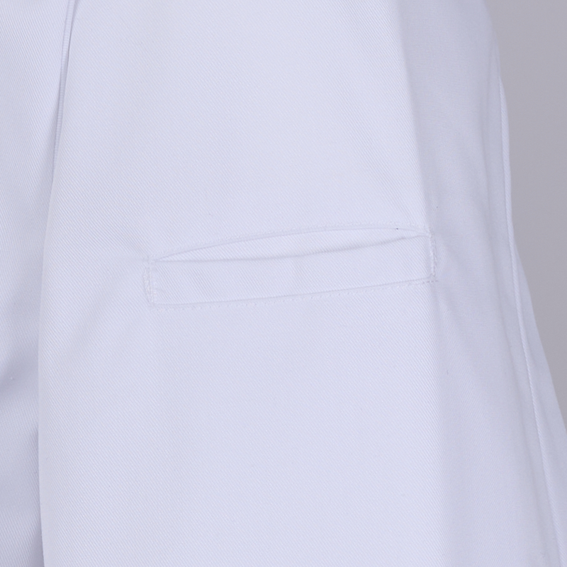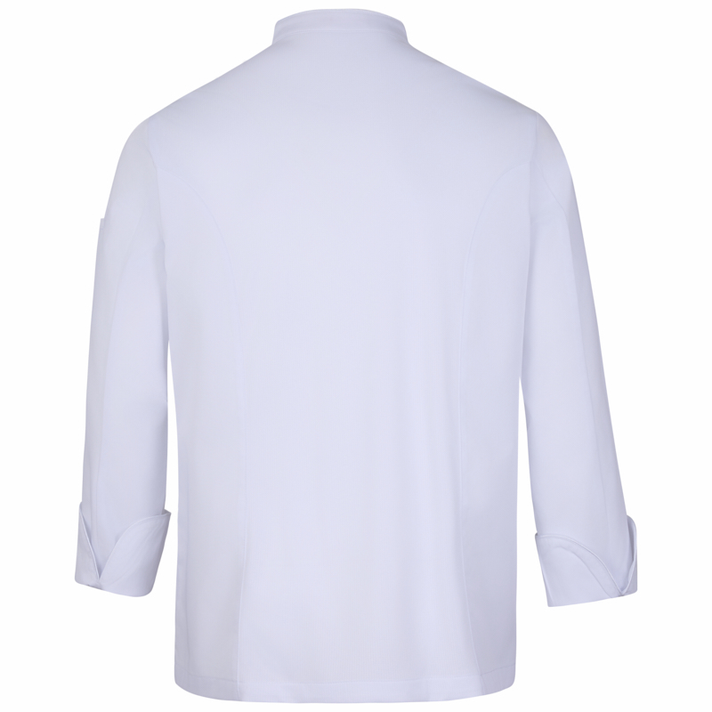 Cierre cruzado con botones automáticos ocultos – Vivos a contraste en cuello, puños y solapa – Bolsillo en frontal izquierdo y en manga izquierda – Ideal para chefs.